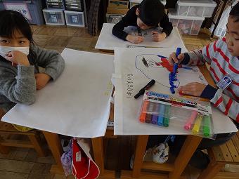 1年生が図工の時間に作品バックを作りました。自分が1年間、作ってきたさまざまな作品を入れるバックです。白い布に、それぞれ思い思いの絵を描いていました。