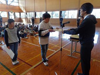 また、大縄記録会の後に全校表彰を行いました。「小さな親切標語」、理科展や読破賞、書き初め展など、友達の良さをみんなで祝福しました。