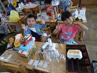 一年生が算数の時間に「形遊び」の学習をしました。生活に溢れるさまざまな容器を使ってチームで創造物を作りながら、形にはいろいろなものがあり、それぞれ特長があることに気付いていく学習です。どの子も意欲的に学習に取り組んでいました。