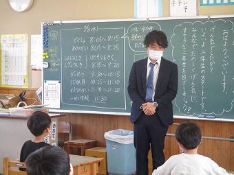 3年生のクラスでは、毎週木曜日、新採指導教員という立場の先生がやってきます。その日は、担任と2人体制で学級運営を行います。朝、放送で全校生に紹介し、その後、クラスで3年生と対面しました。