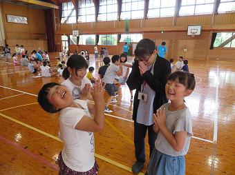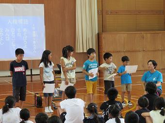 6月から7月にかけて本校では人権月間(いじめ防止啓発月間)を行っています。その一環として、業間の時間に人権集会を行いました。児童が互いに協力しながらゲームをすることで友達に対する思いやりの心を育み、人権への理解を深めることをねらいとしています。人権教育主任からの人権についての話を聴いた後、各学年代表が自分の人権標語を発表しました。その後、なかよし班ごとにゲームを行いました。餃子じゃんけん、キャッチゲーム。どの班も仲よく協力しながら、楽しそうにゲームをしていました。最後にみんなでビリーブを歌いました。温かくやさしい時間をみんなで共有できたひとときでした。