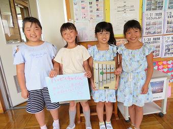 校長室前に「ハッピーチャイム=幸せの鐘」を置きました。幸せなことがあった時、ここに来て、「し・あ・わ・せ」と声に出しながらチャイムを鳴らします。幸せを意識化することで、楽しい気持ちをもって学校生活を送っていこうという意図があります。休み時間、さっそく多くの子供たちが、幸せの鐘を鳴らしに来ていました。