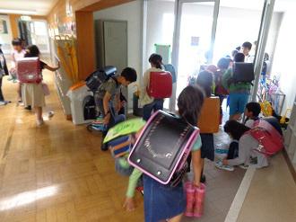 雨の日の一斉下校は、下校班ごとに各昇降口に集まり、集まった班から帰ります。班長さんが1年生をお迎えに行き、並ばせている光景があちこちで見られました。