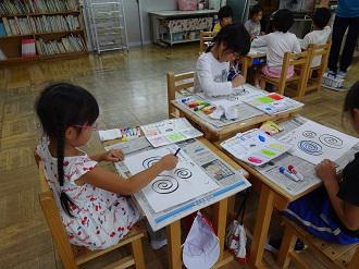 1年生が図工の時間に「くるくるぐるーり」の学習をしました。水彩絵の具に慣れ親しみながら、発想を豊かにする学習です。どの子も、水彩絵の具の微妙な色加減を楽しみながら、想像力を働かせ、素敵な絵を描くことができました。