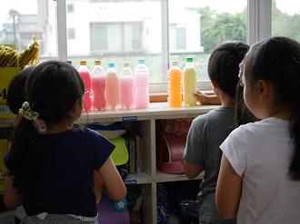2年生が図工の時間に、水彩絵の具に親しむねらいで「虹色コレクション」の学習を行いました。どの子も目を輝かせながら、いろいろな絵の具を水に混ぜて、自分色のコレクションを作っていました。終わってロッカーに並べると、その美しさに、どの子もしばし見とれていました。