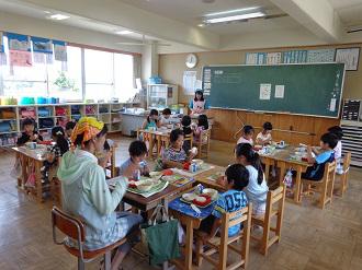 2年生の給食の様子です。みんなで協力して準備をし、楽しく会食しています。食欲旺盛です。