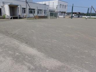 職員昇降口横、給食コンテナ室前の校庭が、ずっと前からへこんでいて、雨が降ると、ぬかるんで大きな水たまりになっていました。保護者でもある地元の会社にご相談したところ、すぐさま、土や砂利を入れ、専門機械等でしっかりと圧迫し、きれいに整地してくださいました。これで雨の日に水たまりができることなく、子ども達が足をとられることもなくなりました。大変ありがとうございました。