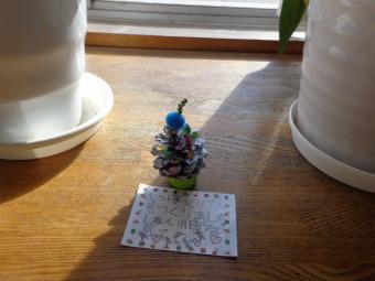 1年生が生活科で作ったクリスマスツリー(松ぼっくりとペットボトルの蓋で作ります)を校内のいろいろなところに飾りました。職員室や校長室、保健室にも、もってきてくれました。校内がこれまで以上に、とても明るい雰囲気になりました。