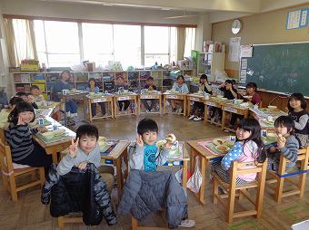 給食の用意をしてくださる給食ボランティアの皆さん、授業支援をしてくださるどんぐりの会の皆さんに感謝の思いを込めて、子ども達との会食を行いました。本当に一年間、お世話になりました。ありがとうございました。