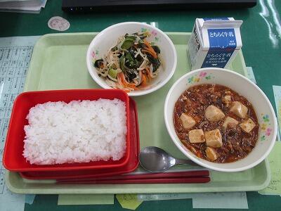 今日の給食は、ごはん、牛乳、マーボー豆腐、糸かまぼこの中華あえでした。