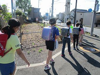 子供たちは、元気に登校しました。1年生にとっては、まだ数回しか登校班での登校はしていませんが、しっかりと並んで登校していました。