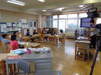 1年生のクラスで初めての外国語活動を行いました。係がALTの先生を職員室にお迎えに来て、教室に案内します。初めての英語の先生に1年生はみんな興味津々です。最初イギリスについての話を聞いてから、簡単な会話を友達同士で行いました。どの子も積極的に英語での会話を行っていました。給食も一緒に食べ、ALTの先生と英語に慣れ親しむひとときを楽しみました。