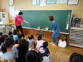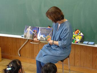 KLVの方が1,2年生に読み聞かせをしてくださいました。ハロウィンにちなんで「大きなかぼちゃ」という絵本です。読み進むうちに、子ども達からは、「何かにしている。」という声があがりました。読み終えて、KLVの方から、「この絵本のアメリカの作家の方が、ロシアの絵本「大きなカブ」が小さな頃から大好きで、この本を書いたのですよ。」というお話を聞くと、子ども達は、「なるほど。」と納得していました。KLVの方から折り紙で作ったハロウィンの飾りをいただき、子ども達は大喜びでした。