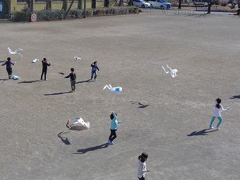 1年生が生活科の学習で凧揚げを行いました。風が強すぎて、くるくる回ってしまうなど、手こずっていましたが、どの子も夢中になって凧揚げをしていました。