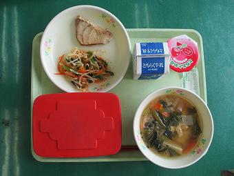 給食は、ごはん、モロのスタミナ焼き、ナムル、かんぴょうの味噌汁、いちごゼリーでした。