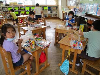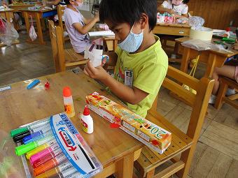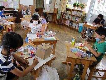 1年生が図工で、「うきうきボックス」の学習をしました。紙箱を使って、さまざまなものをつくります。どの子も、想像の翼を広げて、楽しく集中して造形していました。