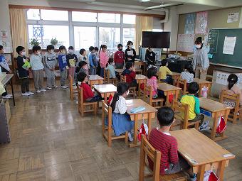 3年生が1年生の教室に出向き、読みきかせを行いました。3年生にとっては、相手意識をもって読みきかせをすることで、また1年生は物語に触れることで、国語の力を高める取組です。3年生も1年生も、真面目に、一生懸命学習していました。