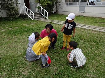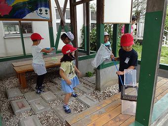 1年生が生活科の時間に、未来の1年生のためにアサガオの種を一生懸命、採集していました。その後、みんなで中庭に出て、秋の虫探しに熱中していました。