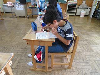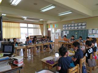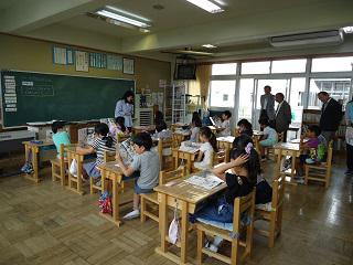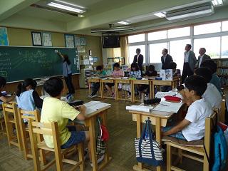 2時間目、4年生は算数でした。わり算の学習です。めあてに沿って、自分で課題を解き、グループで話合いをした後、異なるやり方のどちらがよいのかをクラス全体で話合いました。どの子も真剣に考え、意見を出し合っていました。担任は子ども達のつぶやきを黒板に書きながら、授業を進め、授業後は、授業を観ていた教員と振り返りをしていました。
