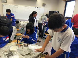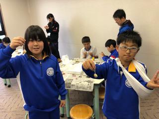 続いて貝の根付けづくりを行いました。二枚貝にきれいな布を張り合わせるアクセサリーです。細かい作業ですが、どの子も真剣に取り組んでいました。大切なお土産がまたひとつ出来ました。