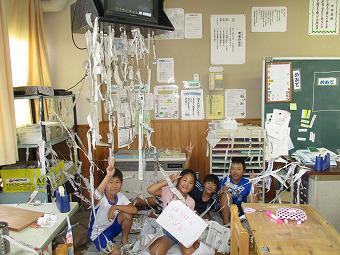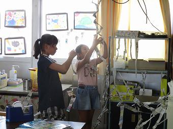 3年生が図工の時間に「長い紙作って」の学習を行いました。教室中をキャンパスにして、自由な発想で新聞紙を長くちぎり、貼っていきます。子ども達は協力しながら、楽しそうに想像の翼を広げていました。