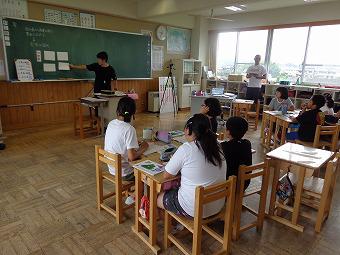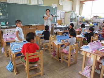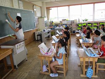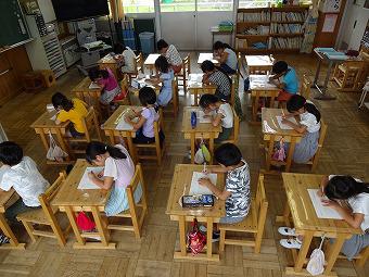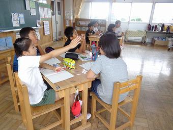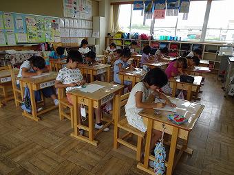 2年生がMIMの学習をしました。MIMとは動作化をしながら特殊音節(はねる音、伸ばす音など)をマスターして、すらすら文章を読めるようになることをねらいとした学習方法です。2年生も、先生の指示で動作を交えて、MIM学習をしました。その後、それぞれ練習テストを行いました。どの子も真剣にテストに取り組んでいました。テストが終わると、全員でてるてる坊主をつるして雨が降らないことを願いました。今日はこの後、水泳学習を行うからです。願いがかなって、水泳学習は予定通り行われました。