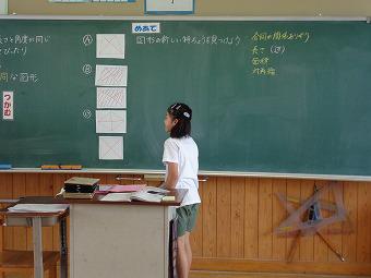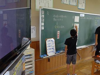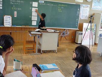 2時間目、5年生は算数でした。合同な図形の学習です。「図形の新しい特徴を見つけよう」をねらいとして、正方形、長方形、ひし形、平行四辺形、台形を仲間分けしてから、自分達で仲間分けした理由を見つけていきます。ワークシートの図形をはさみで切ったり、対角線を引いたりしながら、どんな特徴があるのかをグループみんなで話合いました。その後、何人かが前に出て、自分の意見を発表しました。発表者には質問が飛び、発表者がその質問に答えるうちに、「あー」、「わかった」などのつぶやきが聞こえてきました。最後に一人一人が自分専用のiPadで板書の写真をとり、ワークシートに、わかったこと、考えたこと、を振り返りました。どの子も、ねらいに向かって、しっかり考え、話合い、書くことのできた授業でした。