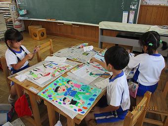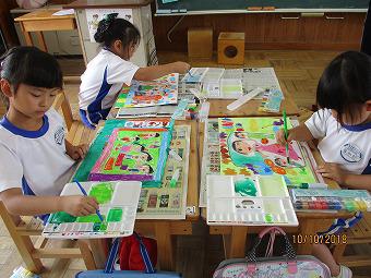 1年生が図工の時間に、「遠足の想い出」をテーマに絵を描きました。どの子も、楽しかった遠足を思い出しながら、一生懸命に筆を動かしていました。