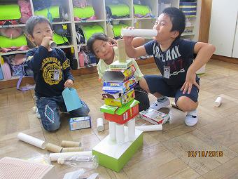 1年生が算数で「かたちあそび」の学習をしました。身の回りにあるのものの形についての観察や活動を通して、立体図形についての理解の基礎となる経験や感覚を豊かにすることをねらいとしています。どの子も立方体や直方体、円柱を組み合わせて、ビルや電車を作ることに熱中しながら、算数の基礎的な力を養っていました。
