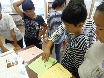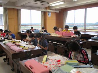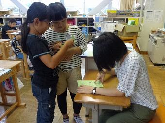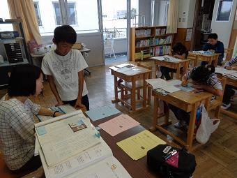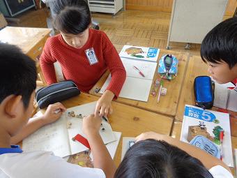5年生が算数の時間に平均の学習をしました。いくつかの数の真ん中、ということはどういうことなのかをグループや個人で考え、発表しあいました。いろいろな意見が出るうちに、みんなの考えが停滞したのですが、「ならす」という言葉がある児童から出たことで、「平らにする」「数を均等にする」などの声があがり、実際に立方体ブロックで説明を試みる児童も出てきました。平均の概念を自分たちで考えることのできた授業でした。