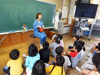 KLVの方が1,2年生に読み聞かせをしてくださいました。ハロウィンにちなんで「大きなかぼちゃ」という絵本です。読み進むうちに、子ども達からは、「何かにしている。」という声があがりました。読み終えて、KLVの方から、「この絵本のアメリカの作家の方が、ロシアの絵本「大きなカブ」が小さな頃から大好きで、この本を書いたのですよ。」というお話を聞くと、子ども達は、「なるほど。」と納得していました。KLVの方から折り紙で作ったハロウィンの飾りをいただき、子ども達は大喜びでした。
