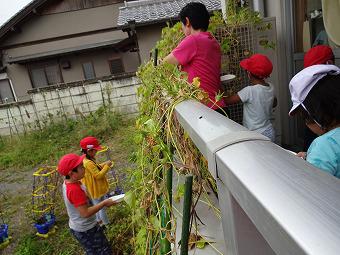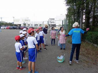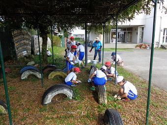 1年生が生活科の時間に、未来の1年生のためにアサガオの種を一生懸命、採集していました。その後、みんなで中庭に出て、秋の虫探しに熱中していました。