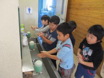 養護教諭が主となって、1年生、2年生が学級活動の時間に、健康委員会は委員会活動の時間に、「正しい手洗い」の学習をしました。手洗いチェッカー(専用のクリームを塗り、その後、手を洗いブラックライトに照らすと、洗い残しがわかる機器)を使って、手洗い後の自分の手を見てみると、洗い残しの部分がたくさんあり、「よく洗わなくちゃ」、「つめのところが汚れている」等、子ども達はいろいろなことに気付くことができました。正しい手洗いの仕方を学んだ後、子ども達は「手洗いの歌」に合わせて、丁寧に洗うことができました。これを機に、風邪、インフルエンザ、ノロウイルス等の病気の予防につなげていきたいと考えています。