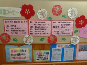 図書室の掲示が1月のものに変わりました。今回の目玉は今年度4月から12月までの図書借り出しランキングです。第1位は、やはり千葉省三作「けんか」でした。さすが楡小っ子です。これからも読書の大好きな子を育んでいきます。また楡小マスコットキャラクター「チュール」の塗り絵も子ども達に大人気です。