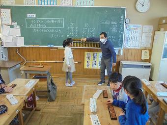 3年生が地域のそろばん講師の方をお招きして、算数でそろばんの学習をしました。初めてのそろばんに、最初はとまどいながらも、興味津々に玉の扱い方、簡単なたし算などを学習しました。日本の誇れる計算機のやり方を知り、どの子もとても楽しそうでした。