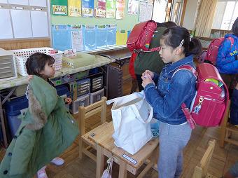 教室に入ると、6年生が、いろいろなお世話をしていました。1年生はどの子も笑顔がキラキラしていました。