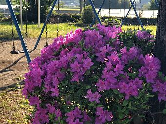 こどもの日。朝の学校です。藤棚の紫が朝日に映えています。雲一つない空に、遠く男体山の頂が見えます。ブランコ横のつつじも満開です。近くの理容店の方が毎年丹精込めて育ててくださっている耕地整備記念碑の下の花もきれいに咲いています。楡小っ子は、今日も楽しいホリディを過ごしていることでしょう。