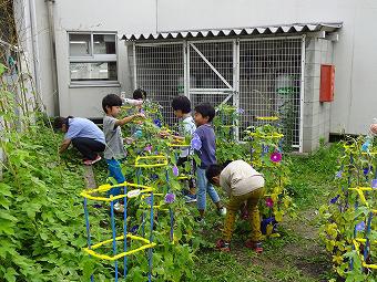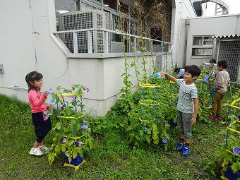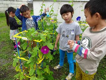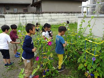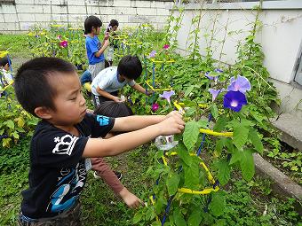 1年生がアサガオを観察をおこないました。みんなアサガオの成長をとても楽しみにしています。すばらしい花を咲かせた自分のアサガオを、少し誇らしそうにどの子も観察していました。