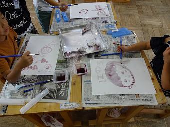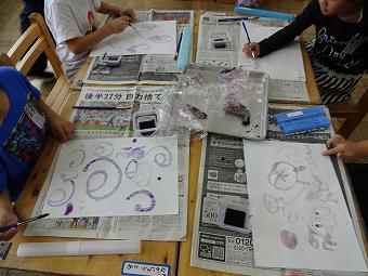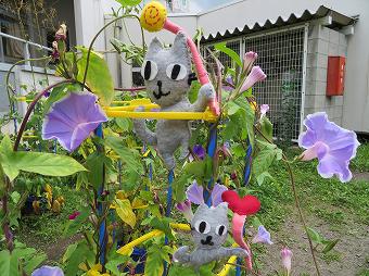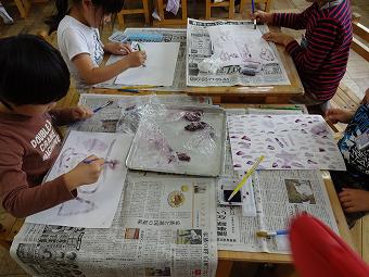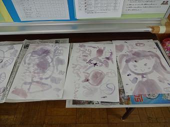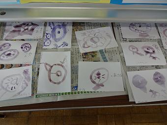 1年生のアサガオが満開です。子供たちの笑顔も満開です。1年生はアサガオの汁で絵を描きました。
