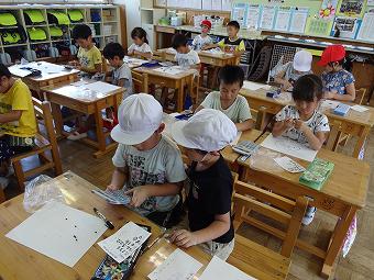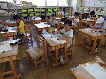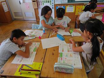 1年生が算数の時間に「どちらが多い?」の学習を行いました。いろいろな形の入れ物に入っている水の量を比べる学習です。いろいろな考えを発表する子供たち。最終的に「同じ入れ物で比べると、わかる」ことに、みんなが気付きました。