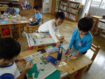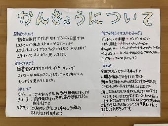 1年生が図工の時間に「びっくりぴょーん」の学習をしました。ペットボトルに穴を開けて、細工をし、息を吹き込むとその細工部分が動くおもちゃづくりです。どの子も想像の翼を思い切り広げて、楽しそうに学習していました。