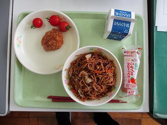 今日の給食は、牛乳、やきそば、ヒレカツ、ミニトマト、いちごのスティックケーキでした。
