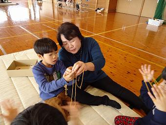 1年生が生活科で昔の遊び体験を行いました。自分のおじいさん、おばあさん、地域の方にボランティアティーチャーとなっていただき、昔の遊びを教えていただきました。コマ回し、羽根つき、お手玉、あやとり、おはじき。今はもうなかなか遊ぶことのない昔の遊びの方法を教えていただきました。子供たちは、いつの時代も遊びが大好き。おじいさん、おばあさんと楽しく夢中になって遊んでいました。授業後は一緒に給食を食べるなど、世代を超えて楽しいひとときを過ごしました。ボランティアティーチャーになっていただいた方々、大変お世話になりました。