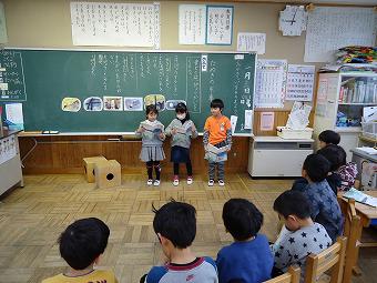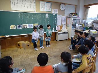 1年生が国語で「たぬきの糸車」の音読発表会を行いました。どのグループも、登場人物になりきって、動作を交えて、楽しく、一生懸命、音読していました。