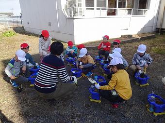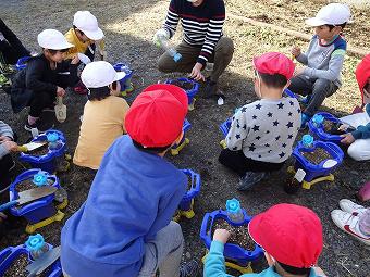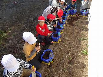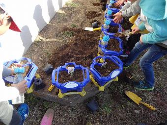 1年生が生活科の時間にチューリップの球根を植えました。最初に自分の鉢に植え、その後、1年生教室前の花壇に植えました。どの子も、楽しそうに、一生懸命取り組んでいました。