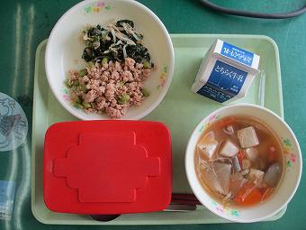 今日の給食は、ごはん、牛乳、鶏そぼろ丼、ごまあえ、けんちん汁でした。