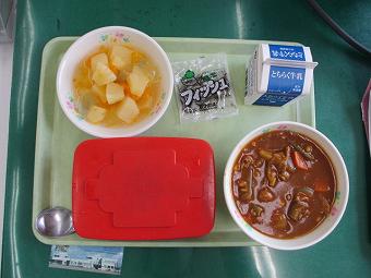 給食は、麦ご飯、夏野菜カレー、フルーツカクテル、ミニフィッシュ、牛乳でした。