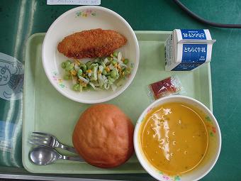 給食は、牛乳、丸パン、白身魚フライ、枝豆とコーンサラダ、パンプキンスープでした。