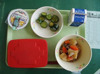 給食は、ごはん、冷や奴、肉じゃが、きゅうりのコロコロ漬け、牛乳でした。