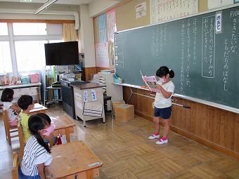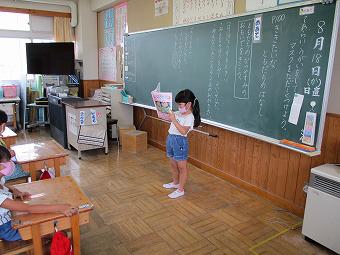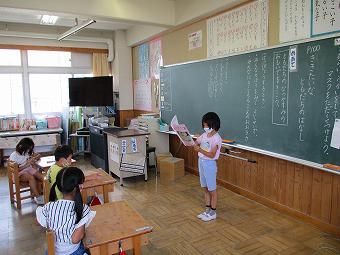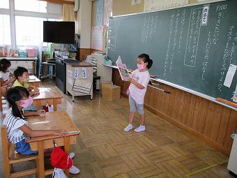 1年生が国語の時間に「聞きたいな友だちの話」の学習をしました。夏休みの思い出を文章にして、みんなの前で発表しました。質問も飛び交い、どの子も聞く、話すがしっかりとできました。